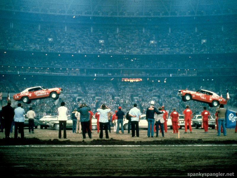 I think we're all in agreement that last night's kiteboarding stunt coulda' been a lot more visually pleasing. We'd all be satisfied if two seemingly unrelated stunts last night coulda' been combined into one. I'm thinking something resembling the 1970's Spanky Spangler Houston Astrodome stunt pictured below. 'Cept substitute a loaded Paris Hilton behind the wheel and Sir Sleaz kiteboarding toward her (instead of the opposing airborne car.) Any other ideas for a better stunt?