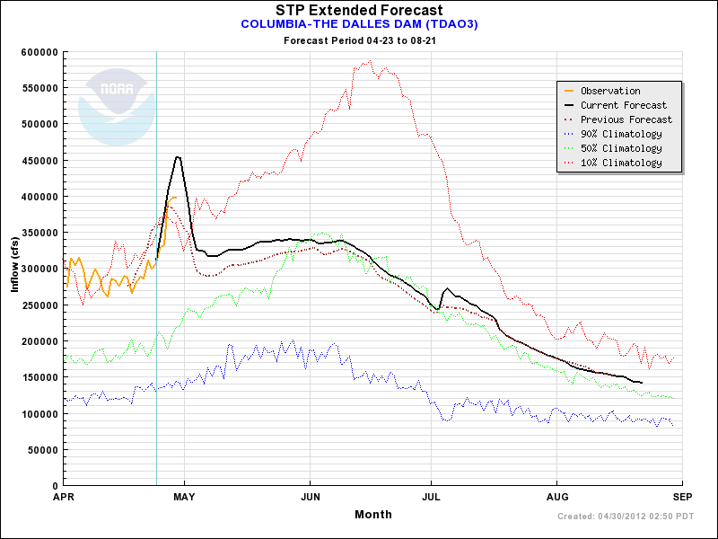 In case you're curious, this is today's forecast for inflow to The Dalles dam. This forecast is used to determine when the Event Site will be switched to Pump/Dry only.