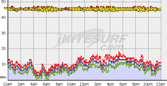 Bill has it pretty correct. Mid teens and inconsistent today, might hit upper teens for a couple hours. Enough to fly your 13m and mess around, maybe ride. High tide is 2:30 so that would help but it is a weak outgoing tide. This mornings out tide is hauling butt. If only the afternoon would be like that and you might have a chance for some half way decent riding.