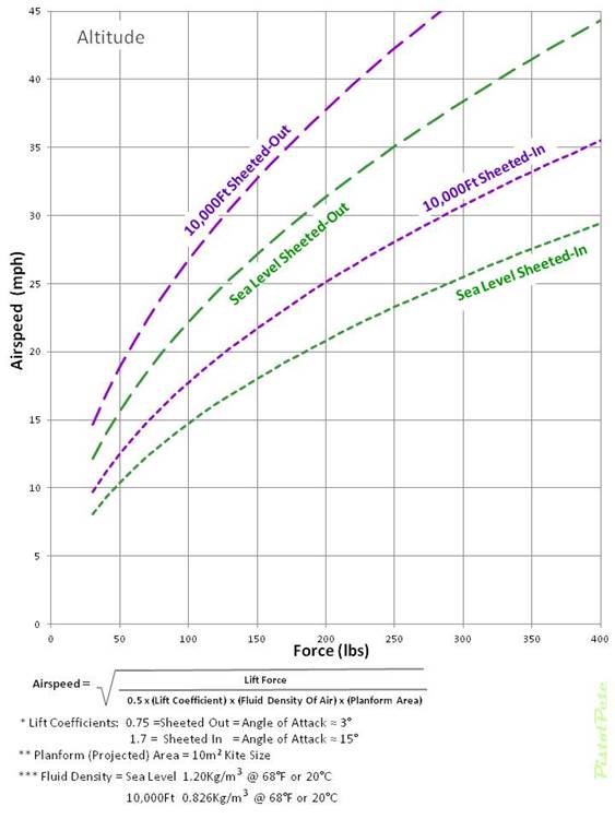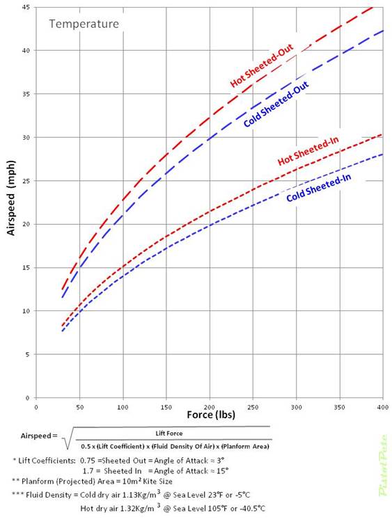 Attached is a temperature plot for the 10m planform area wing. The blue (lower=less wind needed for pull) lines are for air density for very cold dry air (23°F or -5°C = 1.13Kg/m³ @ Sea Level) and the red (upper=more wind needed for pull) line represents very hot dry air (105°F or 40.5°C = 1.32Kg/m³ @ Sea Level). The biggest difference is on the Sheeted-Out plot because lift efficiency is low so, more wind is needed to make up the difference in air density. Some numbers are: