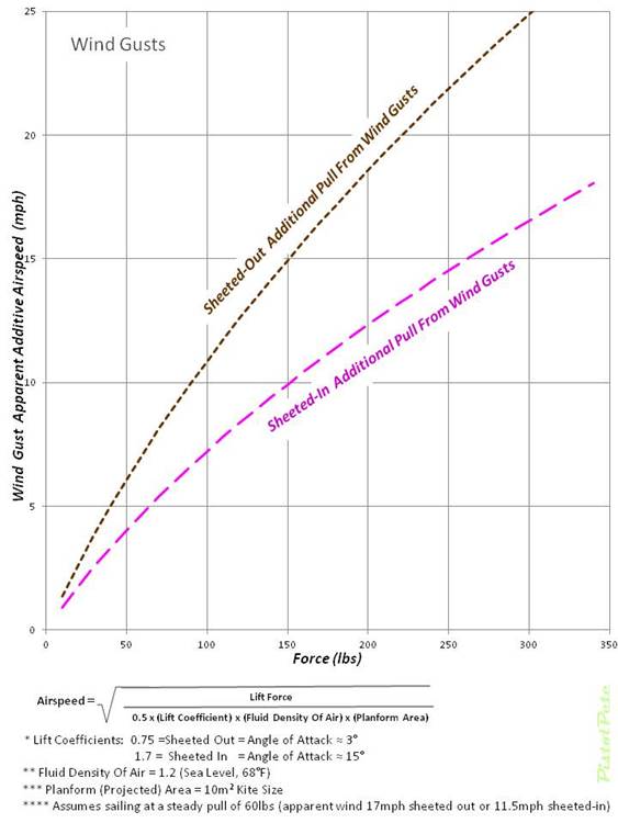 Attached is a plot for gusts-vs-pull assuming 68°F/20°C dry sea level air at 60lbs of steady lift (17mph wind sheeted-out or 11.5mph sheeted-in). For simplicity it is assumed the wind gusts are in the same direction as the apparent wind seen by the kite (worst case). Actual gusts are generally in the true wind direction. The brown (upper) line represents when sheeted-out what gust speeds cause what additional pull. The pink (lower) line represents when sheeted-in what gust speeds cause what additional pull. This plot shows why it can be much more challenging to kite in gusty conditions. And, the lulls that accompany gusts add even more to the challenge (by reducing pull). This plot also illustrates that the effects of gusts/lulls are quite a bit more pronounced when sheeted-in. Some numbers are: