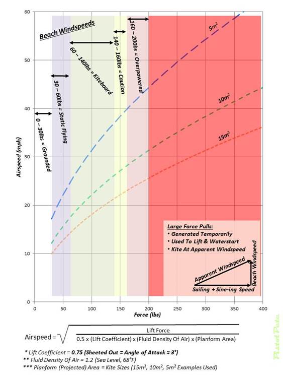 The illustrations have a color overlay indicating a notional limited usable range. There are calculated curves for 5, 10, and 15 square meter planform/projected area kites. This is different than the typical windrange-vs-kite size correlations. Hopefully this helps to visualize the magnitude of force at various airspeeds, using different size kites. What is not included is the direction of the force (vector), which helps determine how useable the force will be.