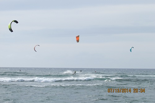 Bring your big kites, and your big twin tip boards. Kailua Beach is always blowing a light 15mph. If you are powered up you will be able to cruise upwind and have some fun. If not you'll still be able to kite, but will go downwind. The folks having the best time are on large twin tips, 160's, and 14 to 17mtr. kites. I'm able to get by on a 14mtr. RPM with a surfboard but I wish I had a bigger board or kite. I weigh 210 and kite powered up, because I'm from Oregon.
