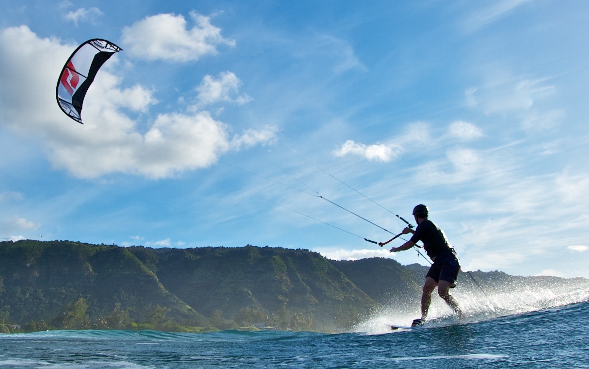 The main kite beach is Kailua town. Kailua is usually blowing trades 14 to 16 average, like a fan. Bring your big kite and your big board. Your biggest twin tip, surfboard, skim will allow you to get up wind and stay there. Kailua is a ENE trade wind spot that usaully picks up around 1pm, but can blow earlier. There are no time restrictions on when you can kite, but parking can be a hassle on weekends.