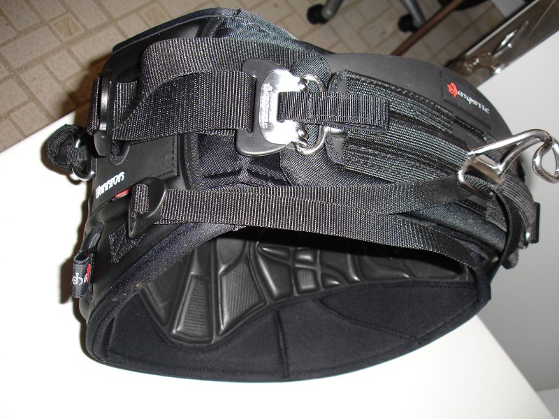 The straps on the belt seem a little too long...May need to cut shorter. No where to really tuck 'em...The safety knife is positioned on the side of the harness....Over all, awesome harness. Comes with bar and pad...The bar doesn't pivot...