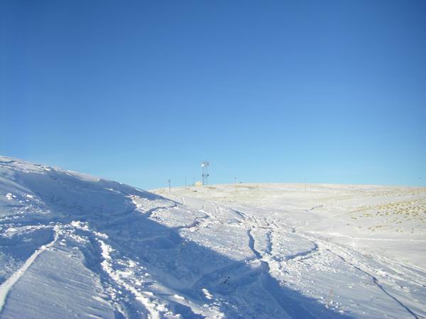 The snow was about twice that deep in the gully to the south of the radio tower, and it looked like somebody had been riding on the side of the south gully recently. The south gully looks like it would take an E to ESE wind pretty good.