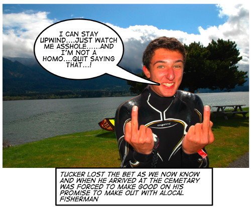 Wonderful day filled with both rain and sunshine! Wind went from WSW, ridable 9m to underpowered, slogging 13m. Jeff and Chris both quit while they were ahead. After swimming for a bit Tucker made it to the cemetery (where I picked him up) and Brad decided to stop in OREGON! Unfortunately he caught a ride from a dude in a 4x4 truck who was waiting for him right at the shoreline (didn't even have to walk)!