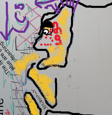 Rotate it 90º and it looks like a purple headed freak with bad acne puking after a river city bar party.