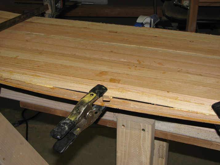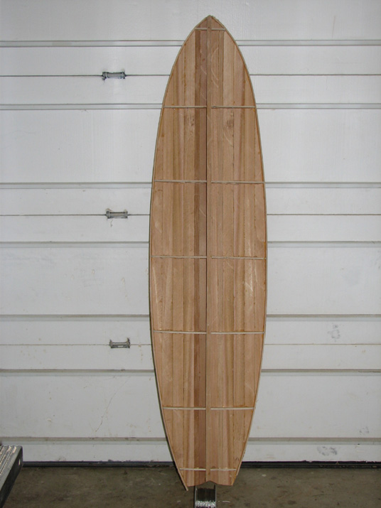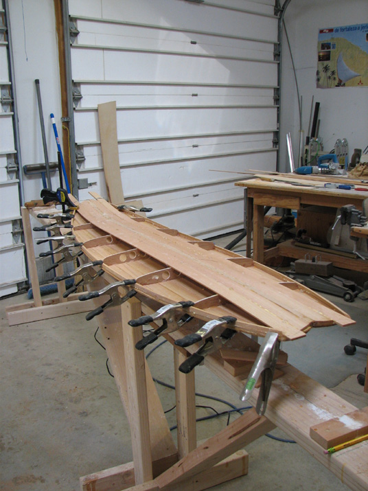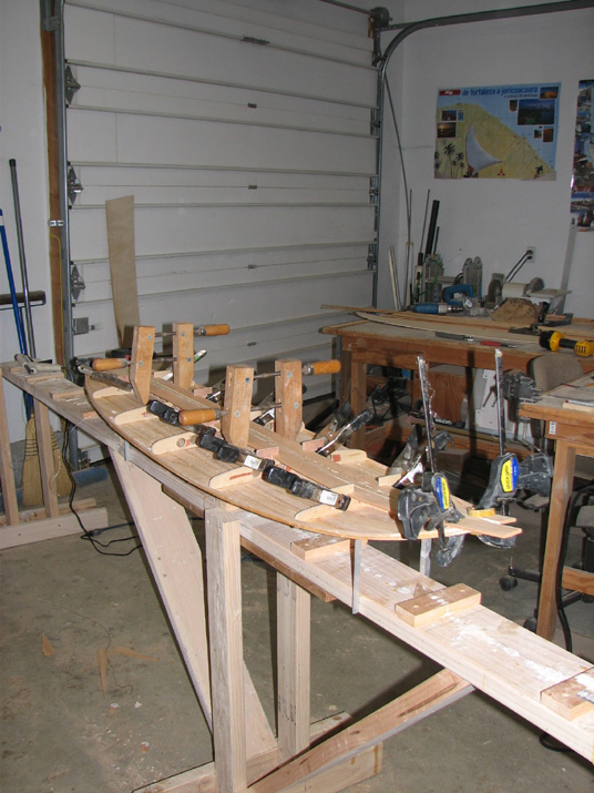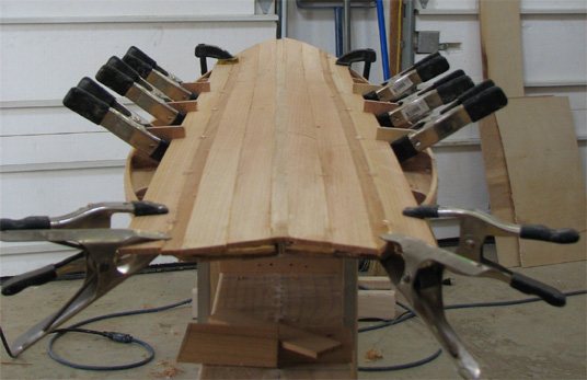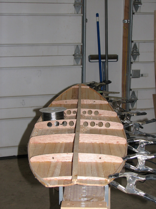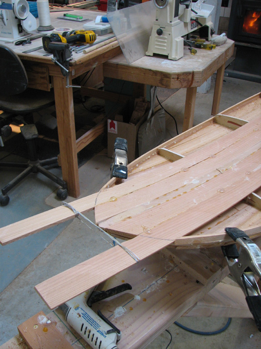 At I guess, I'd say you aren't steam bending, but I don't see staples to the strongback either. What's pulling the rocker into the strips; is the the case that gluing and clamping is sufficient to set the shape? The crosswise lines don't really seem structural but they are certainly intriguing.
