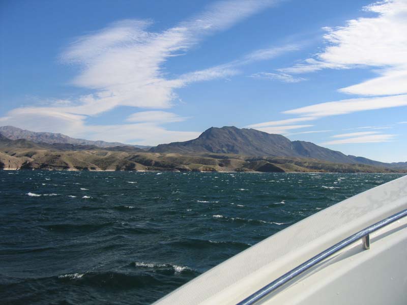 It was dead calm for three days so we rented a 15' aluminum fishing boat and explored the lake (supercool). The next moring the wind kicked in at 40 knots and the return voyage got exciting. The marina called and ordered us to hang out until they rescued us with a bigger boat - I don't need no stinking rescue the waves are totally managable - then we cruise by this 60' houseboat getting bashed against the rocks.