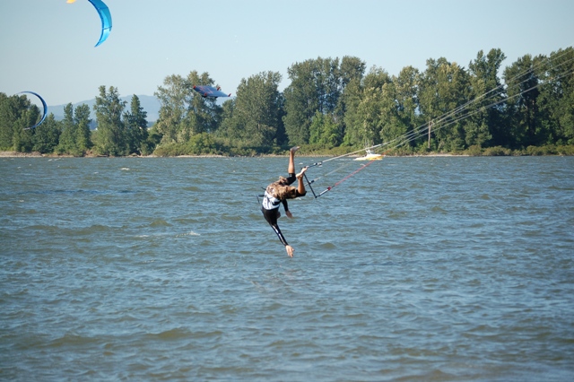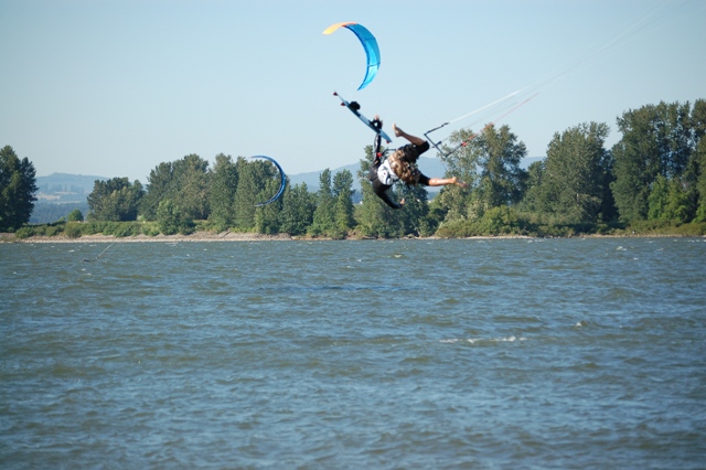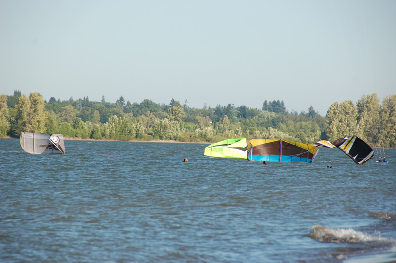 wow......ive never rode there( sauvies )looks nice,,, but things like this are not accecptable i cant believe the words halarious.smiles ect go any where near.. if either kite loads and launches someones screwed at best im not sure if theres a road or powerlines or kids around or near and it looked light 16 weather but if this ever happens when its on it wont be funny but deadly.........think about say the hatch or swell city two kites lite blowing up on the hiway in front of a longing truck hope no ones shackled or still in there loop but hey its halariour...............better you then me ,,,,,first thing cut both lines on one side of one or as many bars in play no questions stay leashed so your kites are not blowing free roll all parties mess up get to beach and deal with the who what where why on dry land gulity party pays for all lines ect and spends the rest of the day or season in the box of shame............we had this happen and the kite blew acrossed the road wrapped a power line loaded up and snapped the pole...blue flame....power company,,,.fire dept... loss of power for 8 hours and the bar was still hanging from the pole not good,,, not funny luckly the kiter got free of his gear on impact kiteing is an extreme sport ......respect....always..........