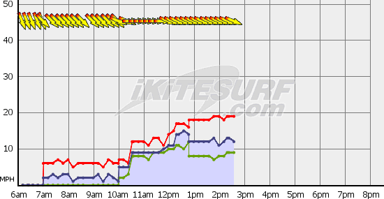 George's Ikitesurf forcast says 11-15 this afternoon... It's still pretty light though. Any thoughts?