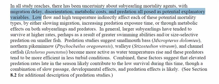 Why do the dams release so much water when salmon smolt are migrating to the ocean? Because they need the fast water to protect them from predator species, many of which are non-native. Salmon smolt are easy prey in slow moving water.