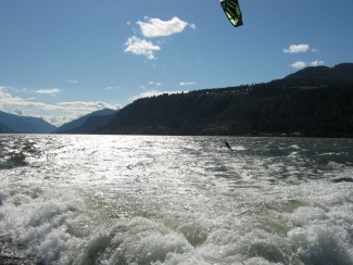 When the Queen of the West stern wheeler goes from Stevenson to Hood River it also makes a very nice swell for as many as four people to play on at the same time. It's a good way to practice your kite turn vs. board turn timing. We've followed it as far as Home Valley before but one of these days I'd like to ride the swell all the way to HR.