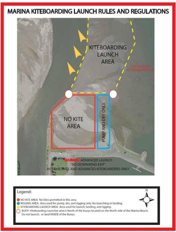 The kite launch at the East end of the Marina Beach is still open and will remain open until we do something to cause the Port to close it for safety reasons.