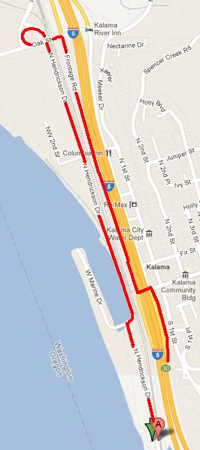 The red path is how you get to the park from Exit 30 (main Kalama town exit). You can use the Todd Road exit but you might have to wait for trains to pass depending on the time of day.