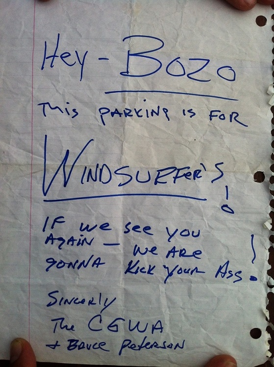 I kid, check out this note a kiter found on his car at the Event Site! I almost barfed I laughed so hard. I believe this to be a joke, so don't get all fired up!
