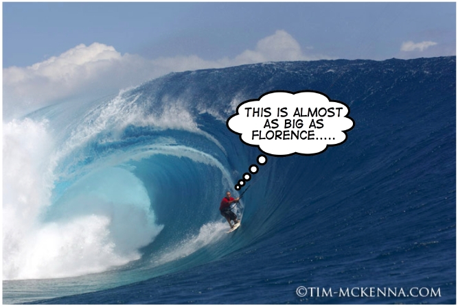Now did ya really have to say Florence sucks! Granted Teahupoo is much scarier but come on now............... Who thought kiting there was a good idea anyway? "Let's see now..... if I tow in on a surfboard I might escape with my life but I think what I really wanna do is attach myself to a kite so when I get tubed I'll be spun around and wrapped up in my lines making a nice tidy package for the coroner"