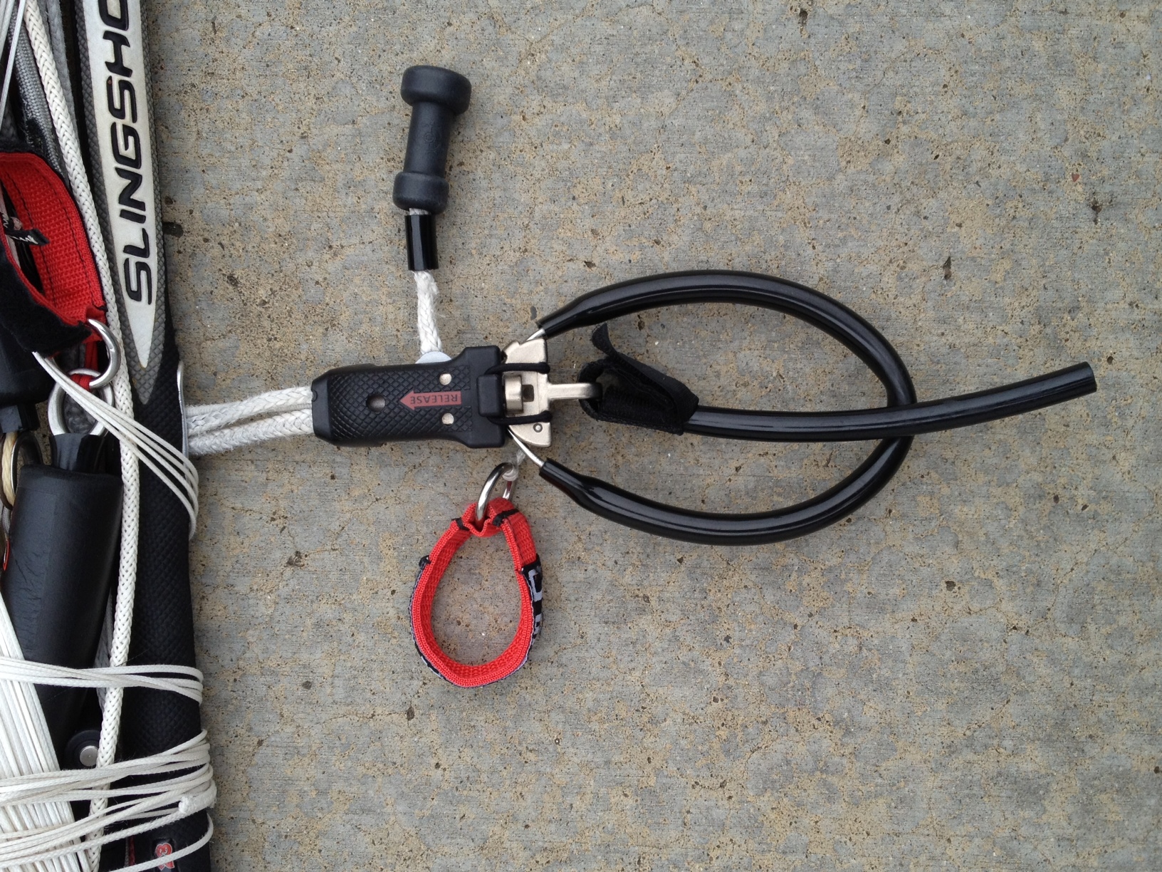 Your hook seems to be lacking a little curve but I don't think that is the issue. When sending the kite and sheeting in with your bar I believe you are YANKING the bar in too hard pulling the loop off of the hook momentarily allowing it to spin sidways straddling the end of the hook and then folding the DD and popping of off under presure. I have seen this happen many times with almost any setup. Don't yank the bar in so hard and all will be fine. _________________ "I don't believe in doing work that I don't want to do in order to live a life that I don't want to live."