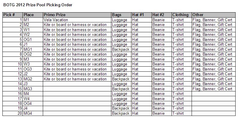 Besides the cash prizes I listed at the top of this page the last two years we've successfully used the "gear pile picking order" format to let the riders choose their prizes from the pool of available stuff.