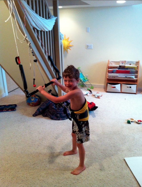 My kids love their setup. I ended up using a bungee cord looped through a carabiner on the steering lines so they can sheet in and out and also have some resistance to simulate the kite pull during turning. They've spent countless hours playing on it and also have a couple boards they use to slide around while they swing. They alternate between unhooked and hooked to play with different moves. I've also hung it from the tree in my front yard to practice handle passes. Thanks again to Eric for giving me the extra bar and the kids harness. They've been well loved.