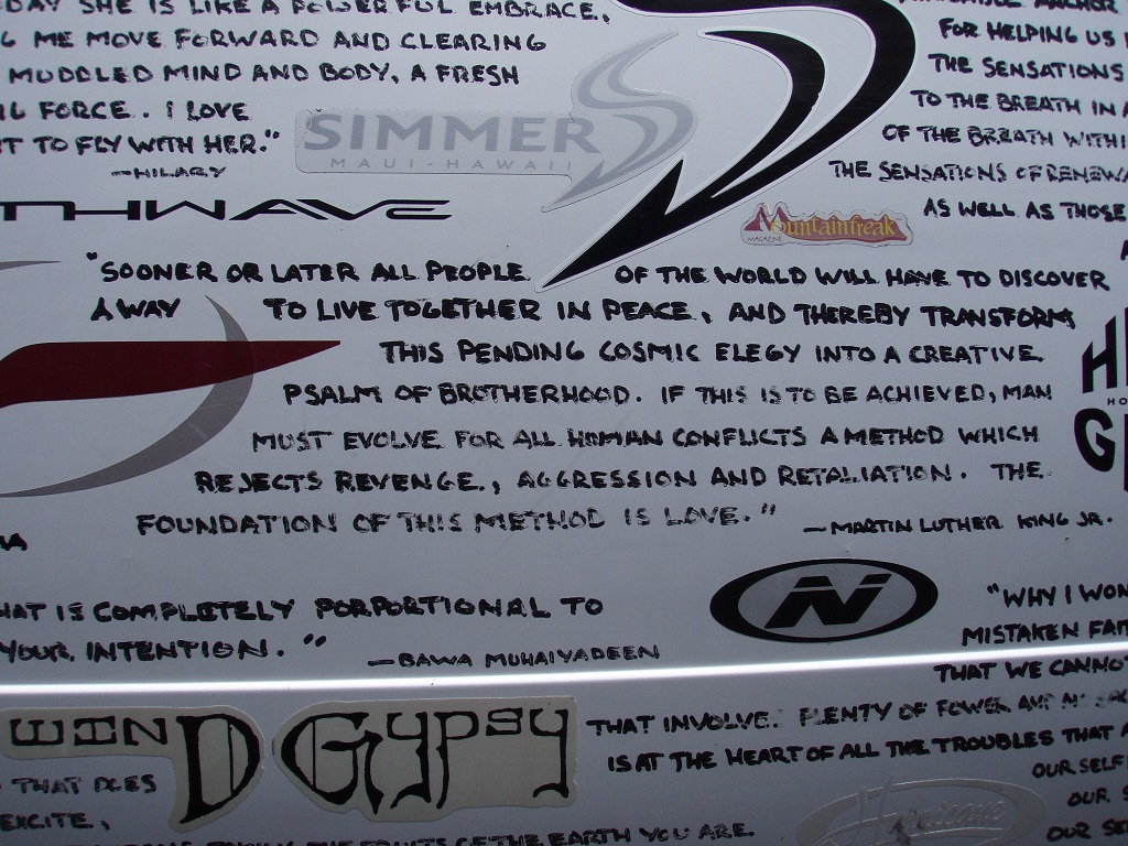 Other than any risk combining the two in one limited spot, all the other crap is background noise, i.e., who has been there longer, locals vs. tourists, strapless vs. strapped, twin vs. surfboard, who carves harder/ dangles higher, and on and on. In order to get along, I agree with the article, we need to work together to define some guidelines to follow, and respect windsurfers right to feeling safe. If that means going down the beach, well then that's the way it is for now. Like any activity, there is a pecking order, and we're at the bottom.