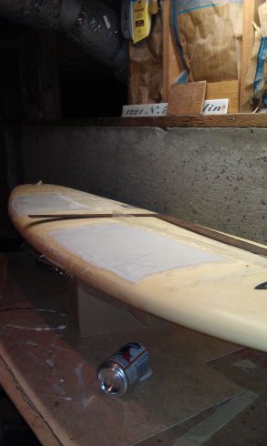 On the coast you are going to beat your board up more getting out through the break than jumping because your feet are on the board with a lot of constant pressure and beating on the board as you motor out over the waves, the pic below shows where I put the fabric, but I glassed it across the width from about 1' from the nose through the hips.
