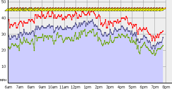 Stevenson was good but gusty on my 6m. I didn't need to point as much as Jones or Rooster, must be less current. Rooster yesterday was crazy on my 6m. Completely lit the whole time. 74 degrees when I left. The sensor was down, or I might passed it for Stevenson. It didn't look too crazy, but the smaller waves fool you. The sensor came back on last night and showed it was 35 with gusts to 45 while I kited! It was really too windy to jump big. I might have to pick up a 4m and a tiny board....
