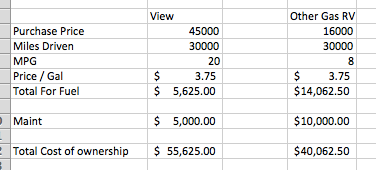 This is if you were able to get a view for 45K and you kept them for 5 years. 30K miles in 5 years is a shit load, which you will probably not meet but I used that number for an example. What can you do with the left over 15k if you bought a gas powered v10? That is a lot of new kites, toys for the kids, and or a few trips to maui.