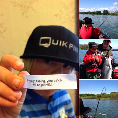 The Quikfin lid-on-the-kid has made him lucky with the finned population lately; caught his first salmon, and a handful of nonretention sturgeon this week with the hat welded to his head.