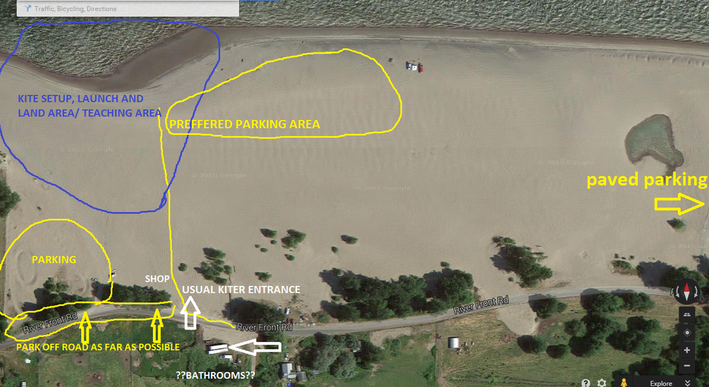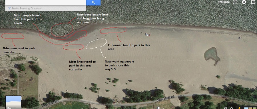 #8: PARKING: Please try and park in groups EAST (to the right when facing river) of the main west beach entrance so everyone has room to set up and launch kites without vehicles in the way or the hazard of a kiter being thrown into a your car or truck!! KITING is not suppose to be like playing LEAP FROGGER when trying to walk to the water with your kite in the air!!!