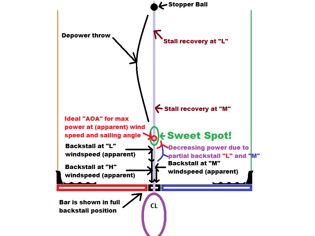 And I guess the point is that a long throw is not really necessary if you have a working trim adjustment to give you access to all of the spots labled on the diagram. If shorten the front lines via trim adjustment, then you could loose access to the backstall points on the bar. If you lengthen the front lines, then you loose access to some of the depower and the light wind backstall recovery points. And even with a long throw, if it is not balanced, you could have line lengths that do not allow access to the lower (backstall portions). This is easy to remedy via pigtails.