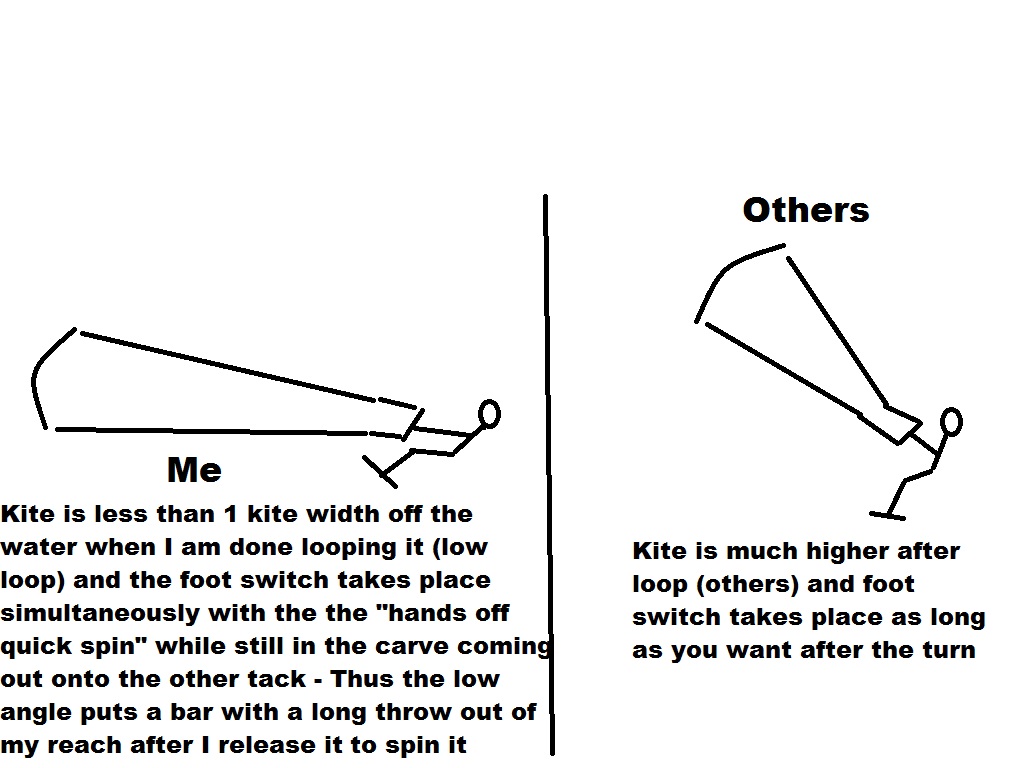Matt V wrote: | When I need to “hands off quick spin” my bar to untwist lines, my kite is typically extremely low to the water. With my foot switch occurring as the board is at a 45° angle while banking out of the jibe, my bar is closer to my knees than my shoulders. |