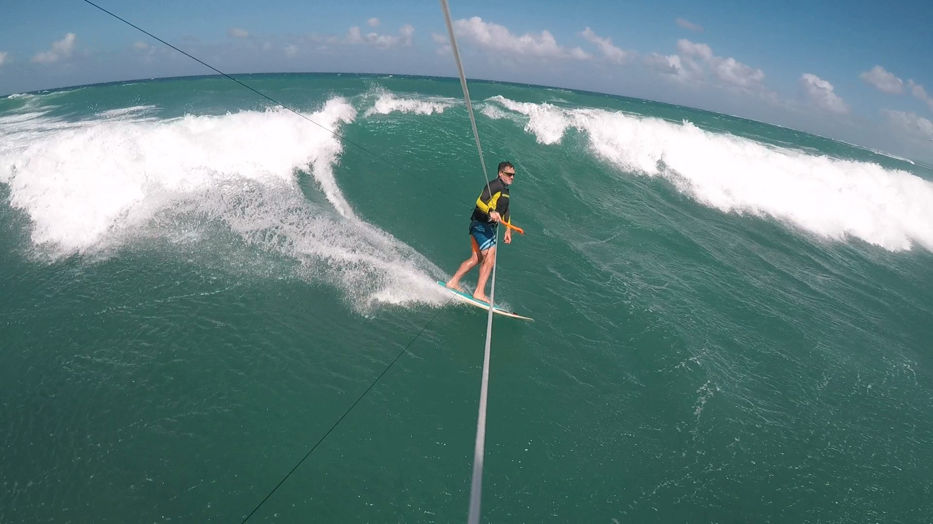 Kite gets you there but then to just use the board--high volume for a mushy wave--to ride the windswell.