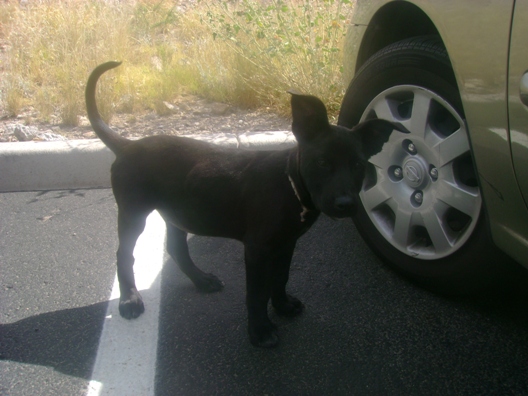 I took these pictures of Conkie this morning. As you can see, she's just smaller than a car tire but will probably be about the size of a black lab. Most people think that she has black lab in her but we don't know what else. She is such a sweetheart and hasn't been a problem the whole way. We will be very sad to give her up. However, being a kid it is already hard to get someone to rent me an appartment and with a dog it makes it that much harder.