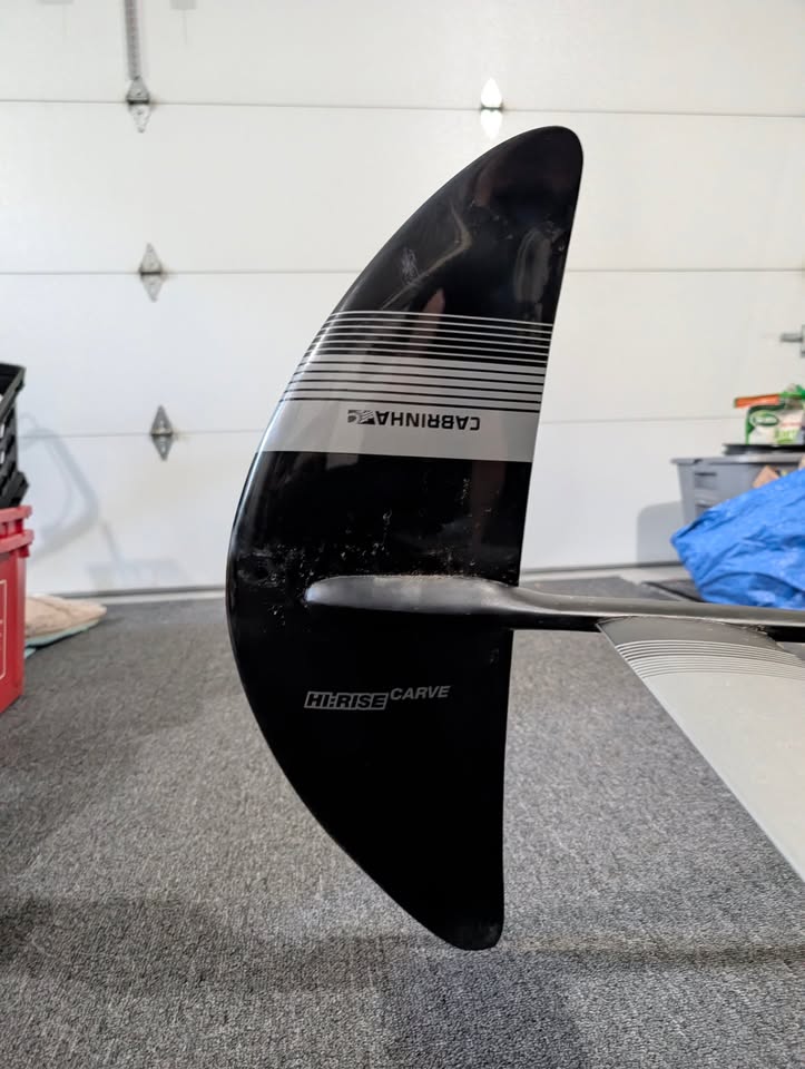Cabrihna Hi:Rise Carve, great first foil to learn kitefoiling, slow, plenty of lift, resilient to breaching, no sharp edges. I was able to pick it up easily on it. Area: 1165cm2