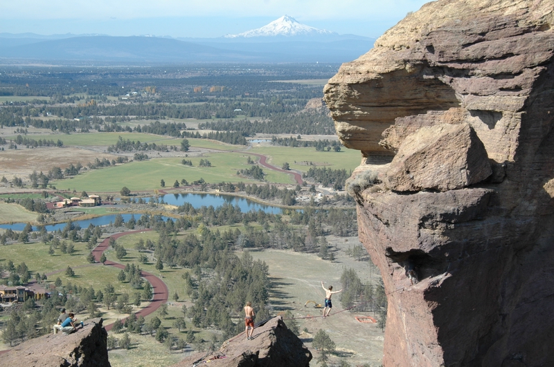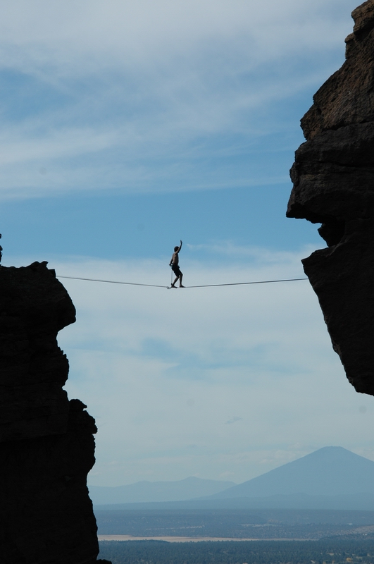 Here's a couple more from last Sunday of the same kid (Kelton). Not kiting, but high-lining Monkey Face at Smith Rocks. Poor kid needs a dump truck to carry his balls around
