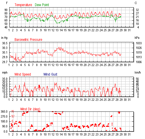 Attached is the weatherunderground wind history carts for Cozumel. Wind is monitored at the airport, which is about 5 mph less that the other side of the island (Wave Ranch, etc.) and 10 mph less that the Country Club and Lagoons.