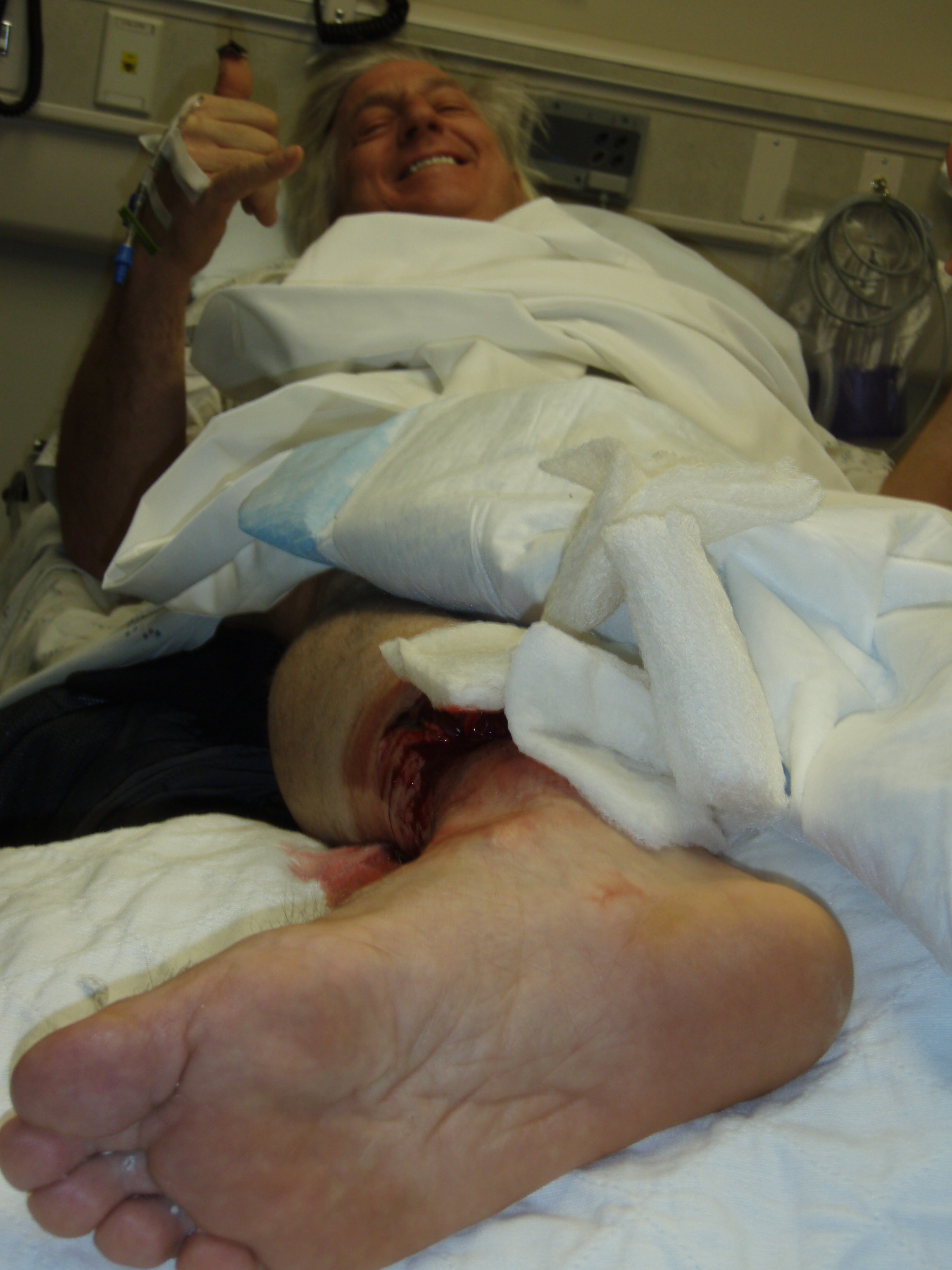 - he's giving instruction to Regi and Heath on how to get his rig off its jacks all the while his leg bone is sticking out