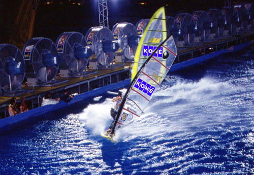 | i watched this on tv once... pretty crazy... there's a wall of fans, and they just shoot out into the pool perpendicular to them....then they do all this freestyle stuff... i think i even saw a race once.