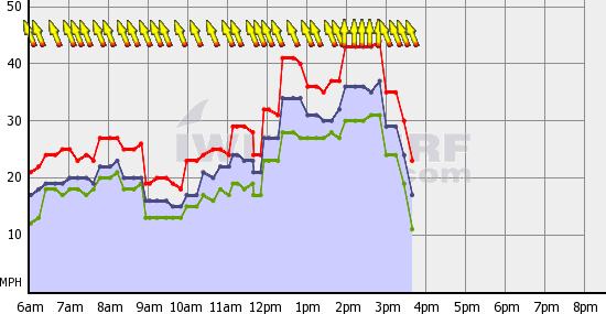 I was out on my '06 9M Waroo a few hours ago, and the wind got weird and scary high....see the graph....geeez! I didn't even want to get close to shore, so I brought it down in shallow water, just for the fun of practicing the self-rescue procedure. I brought the kite down to the water at the edge of the window, and hit the quick-release, letting the bar slide up the rear line reride. The kite spiraled about 6 times, as it drifted into the downwind position, and just would not settle down in the 43 MPH gusts, but kept doing the "alligator death twist", exerting enough force, at times, to almost pull me off my feet. These were great conditions to give a real life test to self-rescue theory, so I decided to play around with the 2 techniques. Even though I have done (mostly for practice) well over a hundred self-rescues, I learned some things today, about self-rescueing in extreme conditions. First, if you are standing in shallow water, and the kite is jumpy, you don't want to do the "one-line" self-rescue. I have 30 feet of spectra leader line on my old-fashioned rear line reride safety system and with both hands, I could not keep it from sliding rapidly through my hands. In deep water, I think that I could have worked my way to the bar, but not while standing in shallow water. This is due to the fact that the standing kiter, as opposed to the floating kiter, has a lot more force exerted on his hands, and this force is instantaneous... even the nice thick smooth leader line would burn my hands. I would not even consider grabbing a thin kite line, even for a few seconds, under these radical conditions, let alone, planning to make the one minute long trip all the way up to the kite. Just to make it easier, I ended up belaying my way to the kite, by hooking the leader line under the hook.