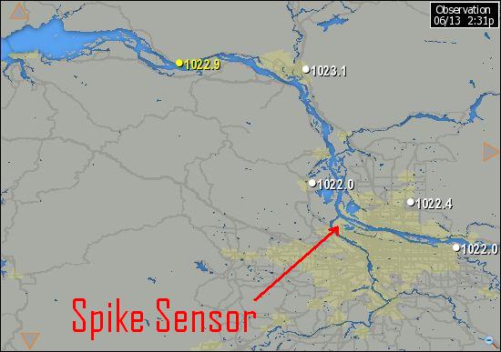 the spike sensor is located at the end of Rivergate Road near the mouth of the willamette. Chances are the wind here is slightly less than at Reader Beach.