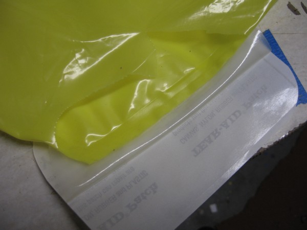 #5 now the fun begins. two important points. One, that shit is sticky, you lay it down, it stays down. two, you do not want any wrinkles in the material under the patch. NONE.
