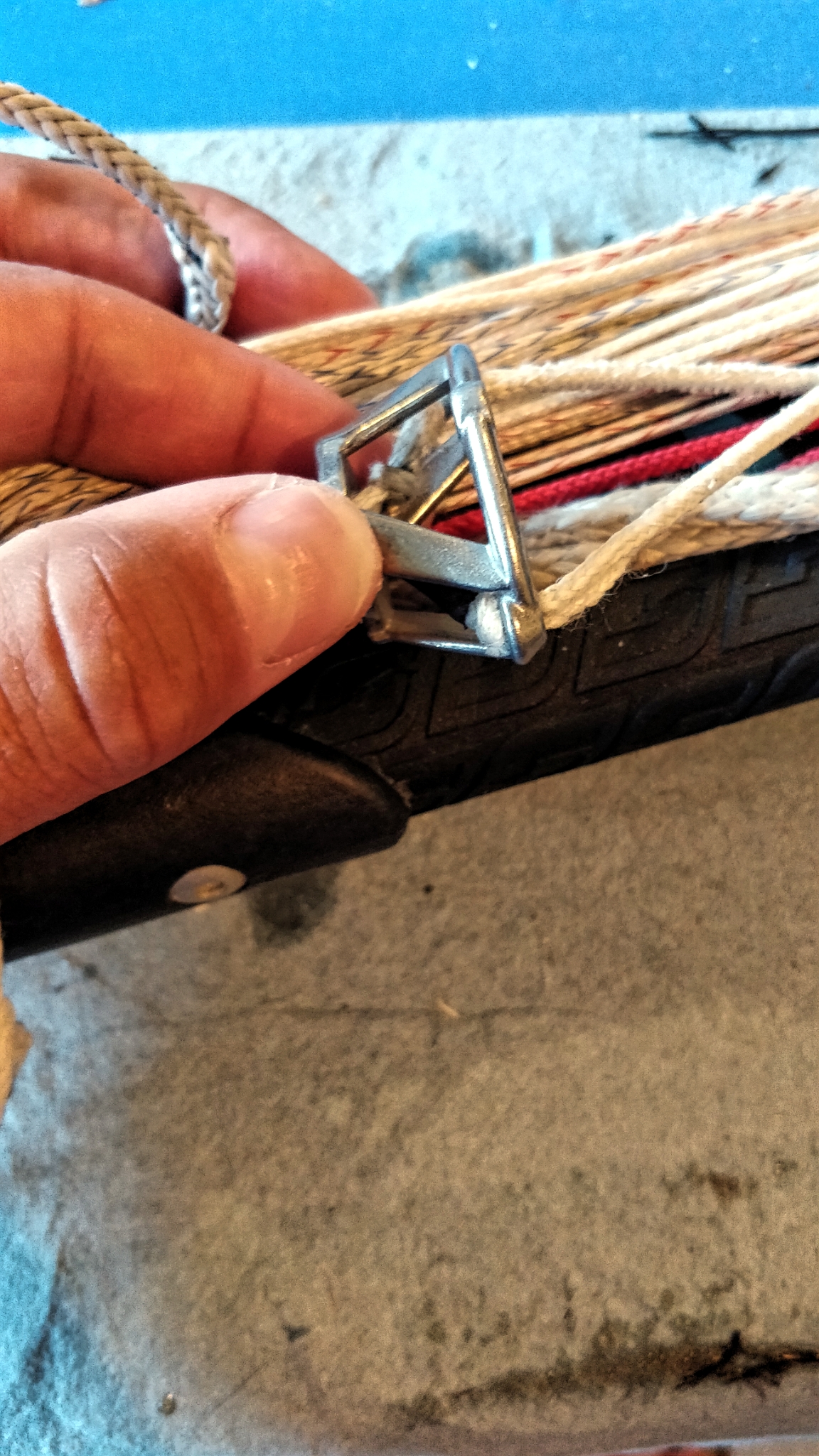 Dern, your last shot of the swivel is what I needed. It's the pass through that is giving me my trouble. I don't have any type of stop on the bottom of the line and therefore, when I was de-powering, the safety line was passing right through and was longer than the other front line.