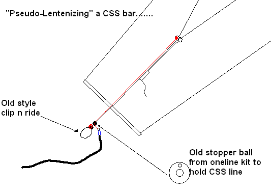 The only problem I see with what you've got drawn up there is upper 'Mickey Mouse Ear.' Because it has a swivel on it, anytime you loop the kite or flip/roll, your new CSS bungee line will wind around the chicken loop, depower cleat/handle, etc. This isn't a problem if you always spin out, but it most likely won't work as reliably as the OEM CSS which will only twist your middle lines. The other thing you'll have to figure out is how to stop the "CSS power line." The LEN10 bar has a safety ring above, which would work similar to the old T2 as a safety. However, all '09 SS bars with the CSS have the Snowman ring with the molded line stop. This stops your power line from running out (via a small knot), instead of using a ring (which would stop when it hit the first 5-line stopper ball).