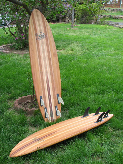 A real board made of wood; just kidding. Wood strips of Northwest woods milled and glued over a closed cell foam. A stringer and cross ribs to define the rocker, top and bottom shape.