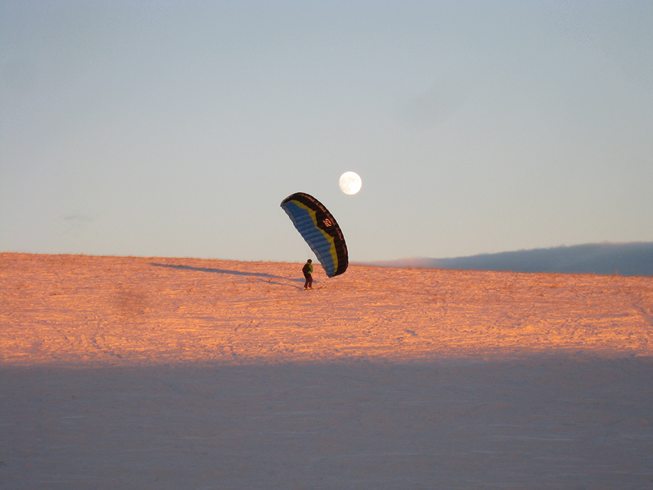 For those kiters who prefer to stay closer to the snow, the week was full of great riding and plenty of terrain features to session. Many of Bald Mountain’s gullies provided us with natural pipes to challenge our freestyle skills. Small changes in the prevailing wind direction allowed for different parts of Bald Mountain to be exploited for our kiting pleasure. Everyday brought a superb sunset session that was dramatic. All week we watched as the sun would set and an ever growing moon would rise in the east, culminating with a full moon that week. Also like clockwork, the lodge’s snowcat would arrive at the kite spot and return the crew back to our mountain home and its awaiting hot tub for a well deserved soak. Dinners were particularly festive; it was definitely a kiter’s lodge! The menu changed daily and no one lost even an ounce of weight that week.