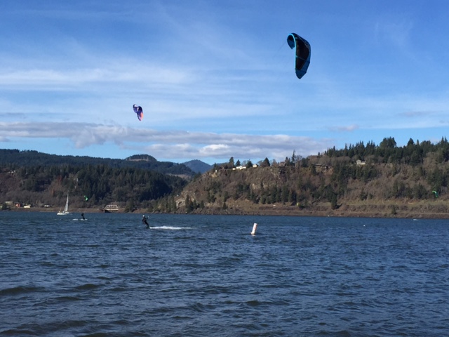 Nice steady wind yesterday in Hood River . 10 -15 kiters , SUPers , Wind Surfers , Sail Boats.