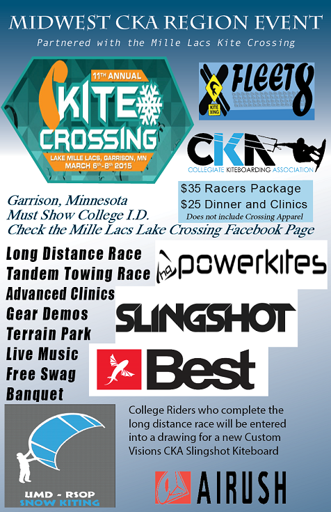 This year the Mille Lacs Kite Crossing will host the first ever Midwest CKA regional event. On March 6 - 8 college students from all across the Midwest will come together to compete and socialize. The event is open to all skill levels. Students will be placed in the CKA standings and not the general admissions standings.