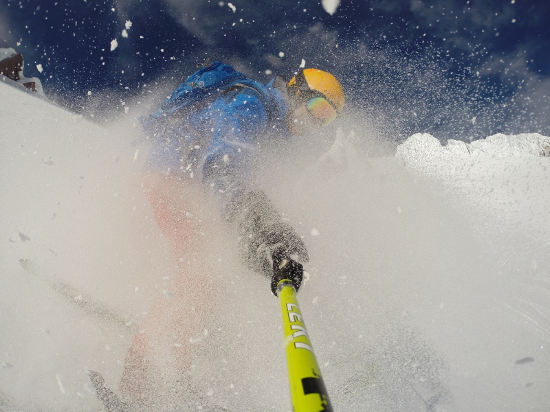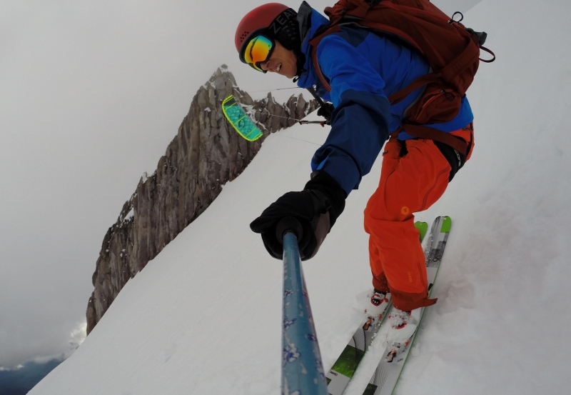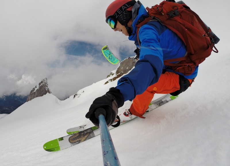 Conditions were really good with 2 feet of fresh powder turned into perfect corn and 12m wind. Was able to kite up to Crater Rock and then did some kite laps on the 40degree slope next to Illumination Rock. Lots of fun. Check out the rocks on the snow in the photo when I stopped to take a break. They rolled down from above.